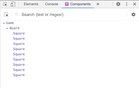 El componente Square renderiza un simple <button> y el Board renderiza 9 cuadrados. El componente Game renderiza un table con valores de posición por defecto que modificaremos luego. Actualmente no hay componentes interactivos.